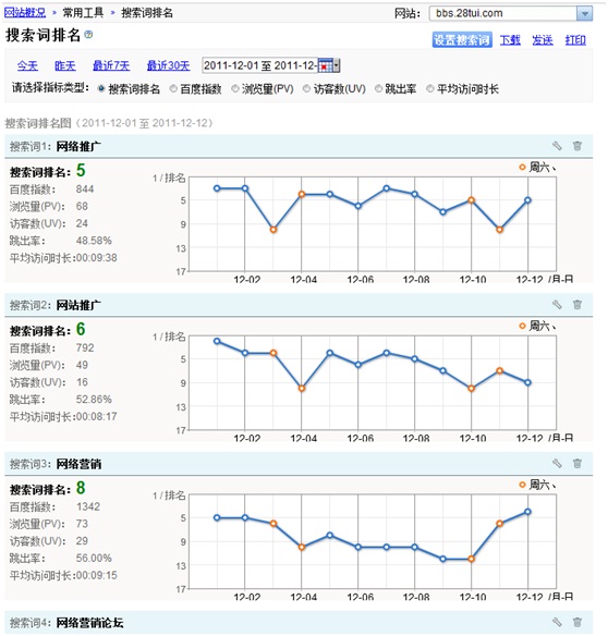 在“搜索詞排名”這個功能上,功能是非常實用的,只要使用百度統計,輸入搜索詞,就能管理你的網站每天搜索詞排名情況。下圖為搜索詞排名報告頁面的截圖,非常明了。