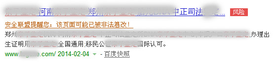 如果我們的網站出現漏洞并且受到了黑客入侵,網頁上被植入了大量黑鏈或者非法廣告都可能出現這種安全風險提示,如下圖所示: