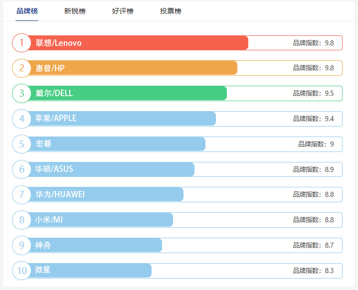 小編在總結得出十大電腦筆記本排名的基礎上,又整理了十大筆記本電腦的品牌指數排行,如下: