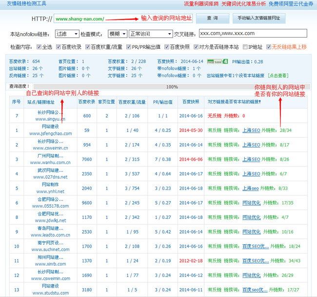 從圖上我們可以看出還可以看到對方網站的pr,百度權重以及導入導出鏈接數(shù)量,由于時間關系不在這里一一贅述,總之友情鏈接檢查工具是個好工具!